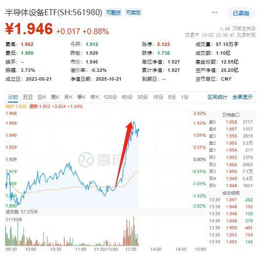 10月22日,半导体午后异动拉升。截至13时40分,表征板块的半导体设备ETF(561980)涨1.35%,一度涨1.71%冲击三连升;今年以来累计涨56.15%。前几大权重股方面,中微公司涨0.21%,北方华创跌0.42%,中芯国际涨1.26%,寒武纪-U涨6.40%,海光信息涨3.41%。资金热度不减股票配资网址之家,截至10月21日,该基金年内规模增长174.21%,最新规模约25亿。